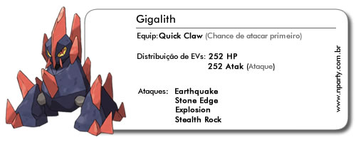 Esse já aparece pela primeira vez nas gerações Black e White, a quinta geração. Com a mudança da regra da habilidade Sturdy esse Pokémon não é mais derrubado em um golpe, já que a habilidade segura o HP do mesmo em 1 de HP. Não que qualquer coisa seja capaz de derrubá-lo em apenas um hit, mas graças à habilidade você te a garantia de conseguir colocar Stealth Rock em campo, caso o dano sofrido seja inferior a 50% do seu HP você explode, algo muito similar ao que Metagross consegue fazer. O set se completa com Stone Edge para pegar engraçadinhos desprevenidos e Earthquake para pegar possíveis metálicos mais frágeis que sejam colocados como Lead. Existe algo muito canalha a se fazer que é colocar o item Quick Claw equipado nele, para que você tenha uma chance de 30% de atacar primeiro que o adversário e garantir o golpe Explosion mesmo contra pokémons mais rápidos e que tenham causado mais do que 50% de dano em você.