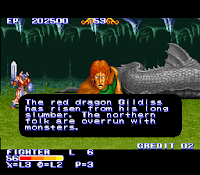 "O dragão vermelho Gildiss ergueu-se após um longo dormindo. O povoado ao norte foi tomado por monstros." (Texto que aparece ao se derrotar o 4º chefe, texto original aqui)