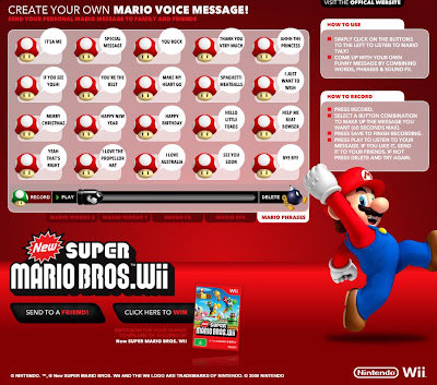 É só se cadastrar no site da NoAU, acessar o link http://www.mario-bros-wii-message.com.au/?clip=259641350999 , escolher as palavras escritas, e enviar para seus amigos. O próprio Mario se encarregará de enviar a mensagem!