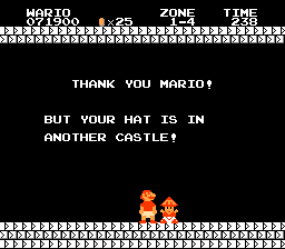 Esta imagem também nos remete a triste realidade em que vivemos. Talvez esse jogo não tenha mais cura, seu vírus de alastrou em muitos de seus órgãos. Reparem que o Toad agradece o Mario, porém o nome do personagem, segundo a barra superior, chama-se "Wario". Os indivíduos nessa cena estão mal trajados, onde o suposto "Mario" está sem seu uniforme de trabalho e vestindo um shorts branco! Mas o mais terrível de tudo, é que o Toad está com um chapéu em forma de ponta de lápis na cabeçae uma tanguinha na cintura! dá pra acreditar? PIRATA!!!!!!