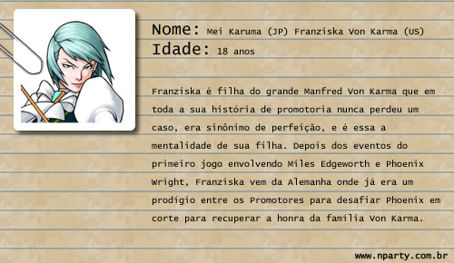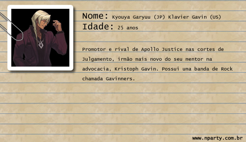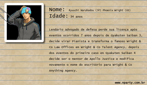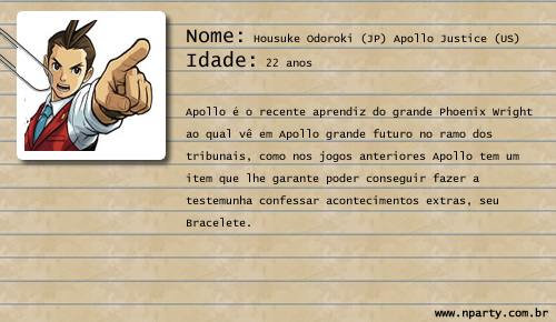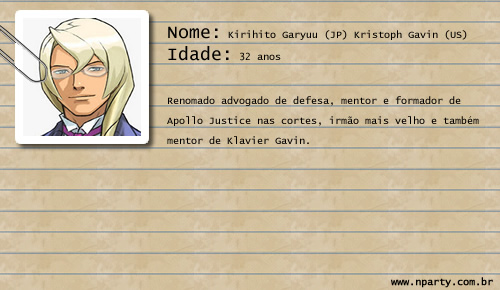 [¹]: Shu Takumi, Designer Japônes, criador e escritor de todos os jogos da série Ace Attorney, também presta sua voz ao personagem principal do jogo.