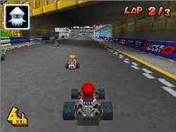 O jogo aproveita as duas telas de uma forma simples, mas muito inteligente: enquanto a perspectiva convencional acontece na tela superior, a tela inferior fica responsável por mostrar o mapa da pista, indicando a posição relativa de cada personagem.