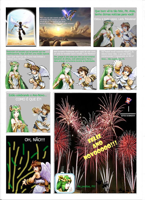 Hello, companheiros! Aqui é seu amigo Osmariobro trazendo uma tirinha com clima de Ano-Novo(uma semana depois, mas tudo certo)! A estrela da vez é o anjo Pit, de Kid Icarus. Nesta tira praticamente nada foi desenhado, queria deixar a história com a cara mais parecida com a do jogo, espero que gostem!