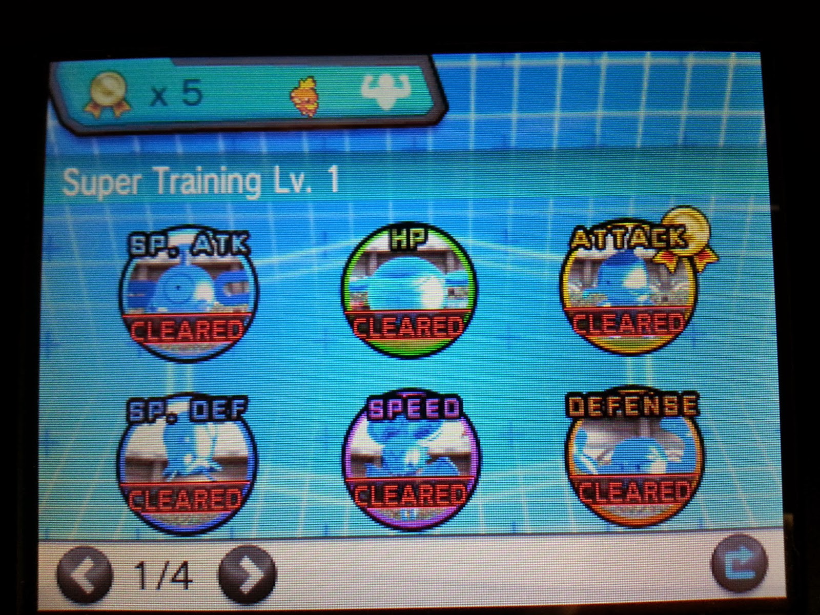 Antes de querer effortar a sério um de seus Pokémon, utilize algum que já possua efforts e jogue todos os minigames até que sejam liberados os minigames de nível 3. Para liberar o nível seguinte é necessário jogar pelo menos uma vez cada um dos treinamentos. Caso seu Pokémon já tenha sido effortado ao máximo é possível jogar os Secret Super Training que serão detalhados no final do guia por terem menos relação com os efforts.