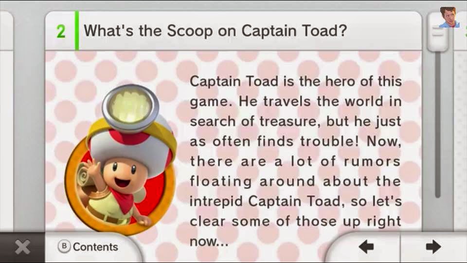 "Capitão Toad é o herói desse jogo. Ele vive viajando pelo mundo e procurando tesouros, mas as vezes ele encontra vários tipos de problema. Agora, existem vários rumores sobre o intrépido Capitão Toad, então vamos deixar claro algumas coisas agora..."