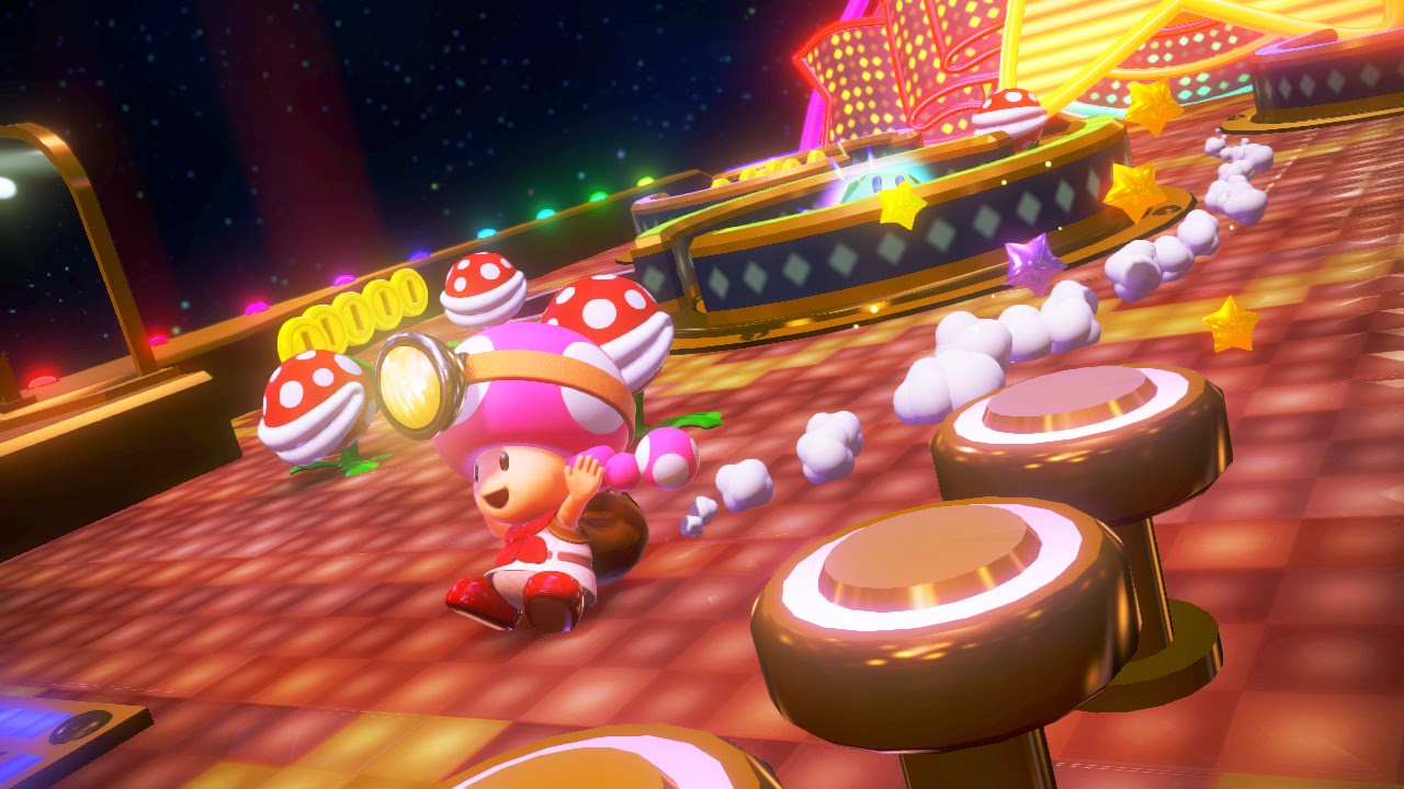 No jogo, ainda é possível controlar Toadette após a resgatar! Infelizmente, o jogo é singleplayer e em apenas alguns momentos é possível jogar com esse "Toad" recorrente dos jogos de Mario. O produtor Koicchi Hayashida diz que Toadette não possui um gênero definido, mas convenhamos que essas chiquinhas entregam um jeito afeminado. Independente disso, Toadette possui as mesmas habilidades do capitão da brigada.