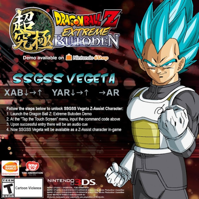 Para comemorar os mais de 80 mil downloads da demo de Dragon Ball Z: Extreme Butoden, a Bandai Namco está distribuindo um código para download de Vegeta no modo Super Saiyan God Super Saiyan. Para desbloqueá-lo, basta seguir as instruções na imagem abaixo: