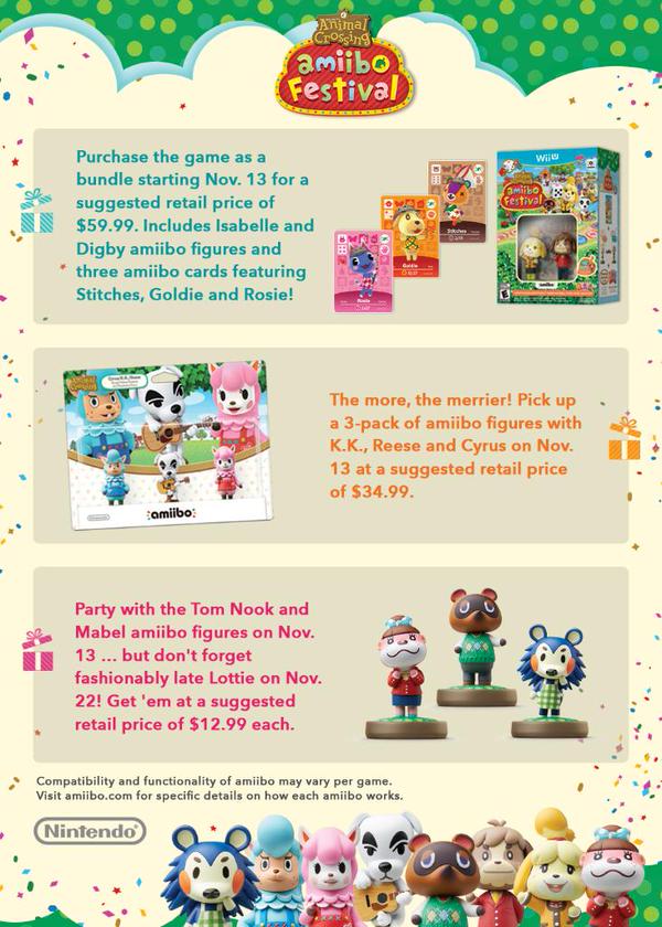 Através de um tweet, a Nintendo revelou a data de lançamento de Animal Crossing: amiibo Festival na América do Norte. O jogo chegará no dia 13 de novembro, e contará com um bundle que inclui as minituras de Isabelle e Digby, além de cards de Stiches, Goldie e Rosie por U$ 59,99 (lembrando que este é o preço comum de jogos de lançamento da Nintendo) e um pacote de 3 amiibos com K.K., Reese, e Cyrus por U$ 34,99. Também foi revelado que as miniaturas individuais chegarão a partir do dia 22 de novembro, ao preço de U$ 12,99.