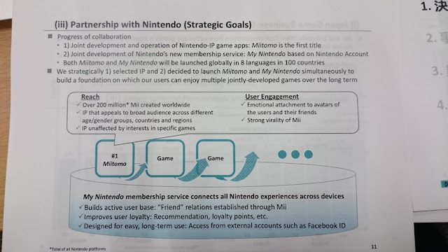 Porém, a DeNA publicou recentemente um relatório de seus ganhos do último trimestre, que incluem pequenas informações a respeito dos apps ligados a Nintendo. De acordo com as imagens, o Miimoto sofreu um atraso para manter a qualidade do jogo, e que tanto o game quanto o My Nintendo serão lançados globalmente em mais de 100 países e com suporte a 8 línguas estrangeiras, o que indica um lançamento simultâneo.