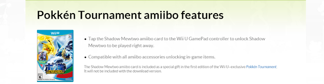 Não é segredo que os amiibos desempenhariam um papel em Pokkén Tournament. Já havia sido revelado que um amiibo card de Shadow Mewtwo lançaria junto com o jogo, com a funcionalidade de liberar o personagem antes da hora. Qualquer anúncio sobre como as demais figuras funcionarão no game fica por conta da Nintendo e da Pokémon Company.