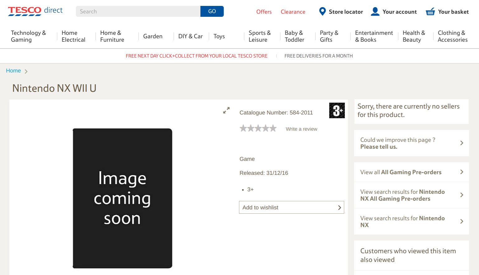 A própria Nintendo já havia indicado que o lançamento do NX aconteceria no ano que vem, mas até o momento nenhum anúncio oficial foi realizado. Enquanto estamos na expectativa de alguma informação nas próximas semanas, a loja da Tesco - uma grande revendedora do Reino Unido - havia criado uma página para a pré-compra da do aparelho ao preço de £349,99 (algo em torno de R$ 1247), um valor próximo da edição deluxe do Wii U em sua época de lançamento.