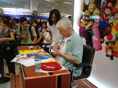 O cara é muito simpático e passou a tarde inteira dos dois dias de evento tirando foto com os fãs e autografando desde o poster disponibilizado pelo evento até coisas trazidas pelos fãs, como Jogos, DSs e Wiis!