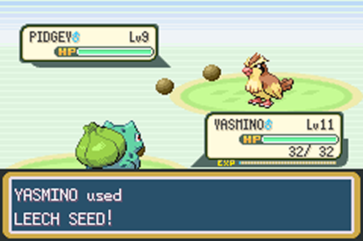 Subo pelo matinho, e ao virar a esquerda, dou de cara com o meu rival, que inicia uma batalha. O time dele me deixa em total desvantagem, mas nada que um pouco de estratégia (em grego strateegia, em latim strategi, em francês stratégie... Os senhores estão anotando?) não me deixe a frente do meu rival. Um Leech Seed logo de cara me garante não perder vida com seu Pidgey, e descer a porrada em seu Charmander.