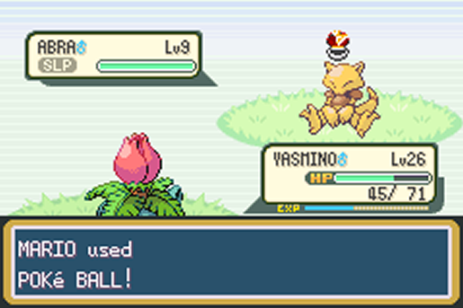 Chegando agora na Route 25, vou direto para o matinho acima, a procura de um Abra. Capturei o primeiro que encontrei, usando o Sleep Powder de meu Ivysaur. Apesar de possuir excelentes status, eu não tenho intenções de usar o Abra em meu time, pois ele terá propósitos futuros (confiram a parte 3 para ver seu destino!).