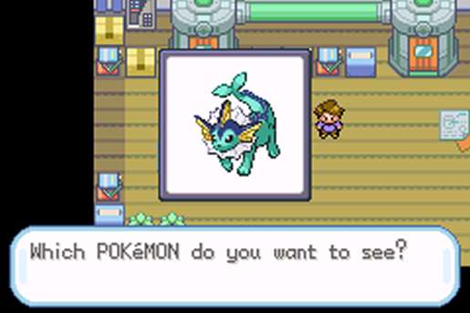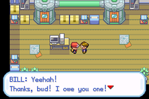 A partir de agora, o meu sistema de armazenamento de Pokémon será administrado por Bill. Não satisfeito, saí e entrei novamente em sua casa, mas desta vez, fui direto a seu PC, conferir as fotos de seus Pokémon favoritos (Eevee e suas evoluções). Um deles será parte do meu time, em breve.