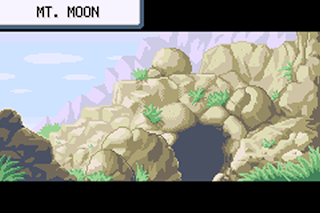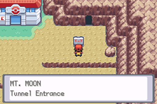 Subindo na rota, aproveitei a conveniência de um Pokémon Center no meio do mapa para curar meu Pokémon. Sendo assim, me preparei para entrar na primeira caverna do jogo: Mt Moon.