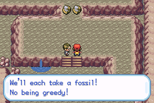 Derrotando-o, ele me permitiu escolher um dos fósseis. Escolhi o da direita, Helix Fossil, enquanto ele pegou o da esquerda.