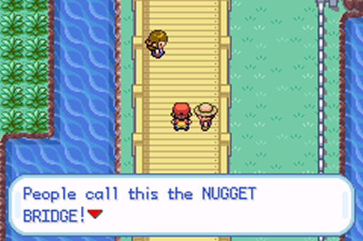 Subindo mais um pouco pela Route 24, cheguei na Nugget Bridge, onde 5 treinadores estavam dispostos para me enfrentar. Segundo o primeiro treinador, eu deveria enfrentá-los na sequência, a fim de ganhar um fabuloso prêmio ao final.