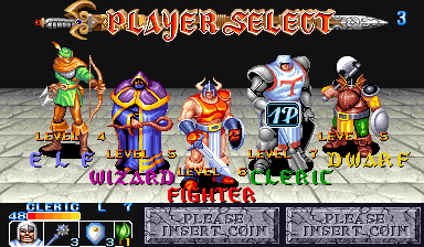 Você pode optar entre 5 personagens diferentes (Fighter, Cleric, Wizard, Dwarf e Elf), cada um com qualidades e habilidades diferentes entre si. Os personagens não podem ser alternados no meio do jogo, ou seja, não há a possibilidade de você escolher a personagem que tem o melhor desempenho em certa fase, embora o mais importante seja, de fato, você pegar a prática e, principalmente, as manhas para enfrentar os chefes. A seguir, você pode conferir as peculiaridades de cada personagem: