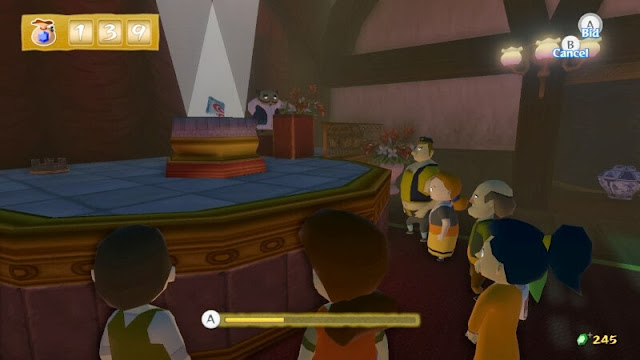 Como funciona o leilão: Personagens aleatórios do jogo estarão presentes para dar lance no item, e você tem uma barra que, apertando o A, vai sendo preenchida aos poucos. Quando a barra chegar ao fim, você poderá dar seu lance. E também, quando você aperta o A uma vez, a barra vai sendo preenchida em um ritmo bem mais lento, automaticamente.