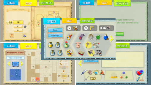 A primeira, Items, mostra o inventário do herói, com todos os itens e acessórios que você coleciona durante o jogo, permitindo que você possa associá-los aos botões X, Y e R movendo-os para o desenho do botão que se encontra no topo da tela, agilizando a manutenção dos mesmos nos momentos que você mais precisa. Este menu possui uma segunda tela que mostra status de coisas colecionáveis, como pieces of heart, as partes da triforce e coisas que você já conseguiu na aventura como as espadas, escudos, o Pirate's Charm, etc.