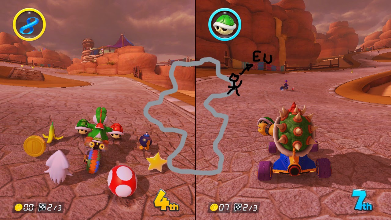 O máximo que o jogador conseguirá fazer enquanto corre e controla seus itens para garantir a primeira posição é olhar rapidamente para o mapa e conferir se o corredor que está atrás de você está em uma distância boa e qual jogador está segurando qual item (ou seja: alguém pegou um casco azul?) e isso o GamePad mostra com eficiência em uma única tela.