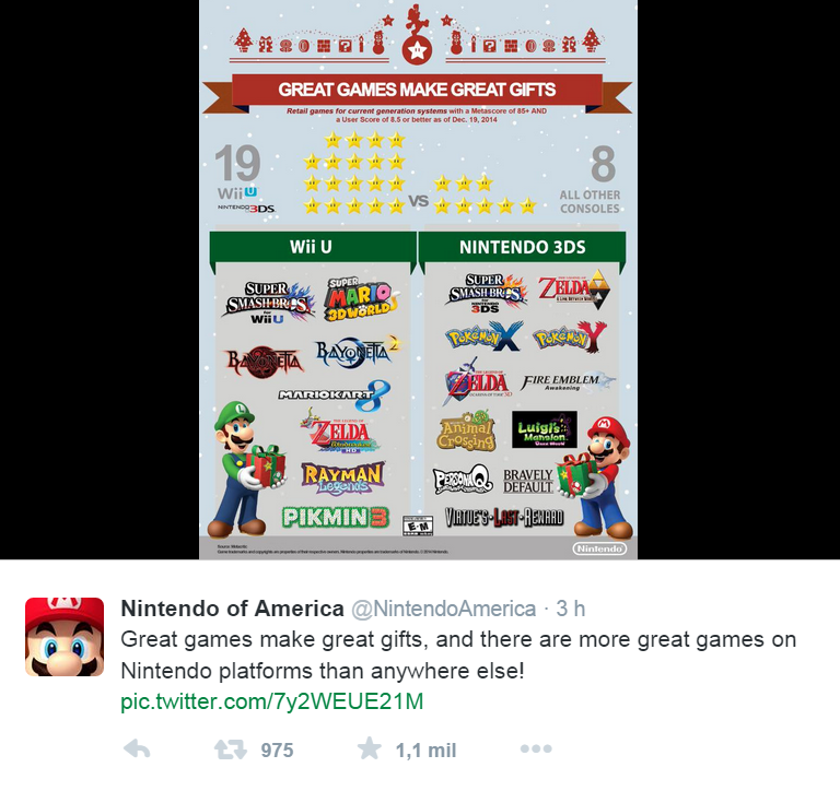 Nintendo of America declarou guerra contra o outros consoles produzindo o infográfico que você pode ver abaixo. A empresa diz que há mais grandes jogos em plataformas da Nintendo do que em qualquer outro lugar e tem estatísticas e números para provar isso. Felizmente é tudo feito de uma forma agradável, mas faz provar um ponto importante, que o