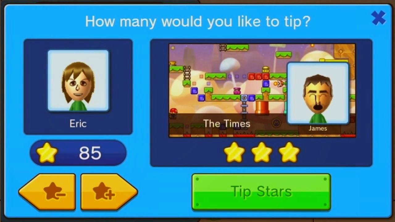 Contudo, uma novidade surge com relação a disponibilização das fases criadas e liberadas no Miiverse. Agora, os criadores podem receber uma espécie de "curtida/doação" de outros jogadores. Por exemplo, caso você tenha jogado uma fase criada por "X" e gostou dela, você pode curtir a fase, e doar algumas de suas estrelas para ele. Assim ele recebe as estrelas doadas para continuar criando fases desafiadoras, que pode ser no estilo que da que você jogou ou criando uma nova fase muito melhor! E além de gostar da fase dele, o jogador pode bonificá-lo para que o jogador "X" continue criando boas fases!