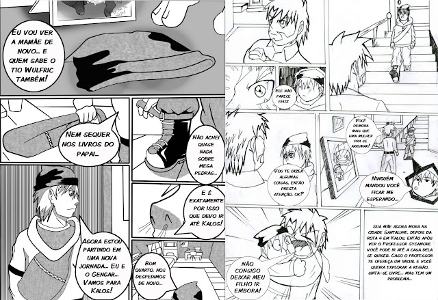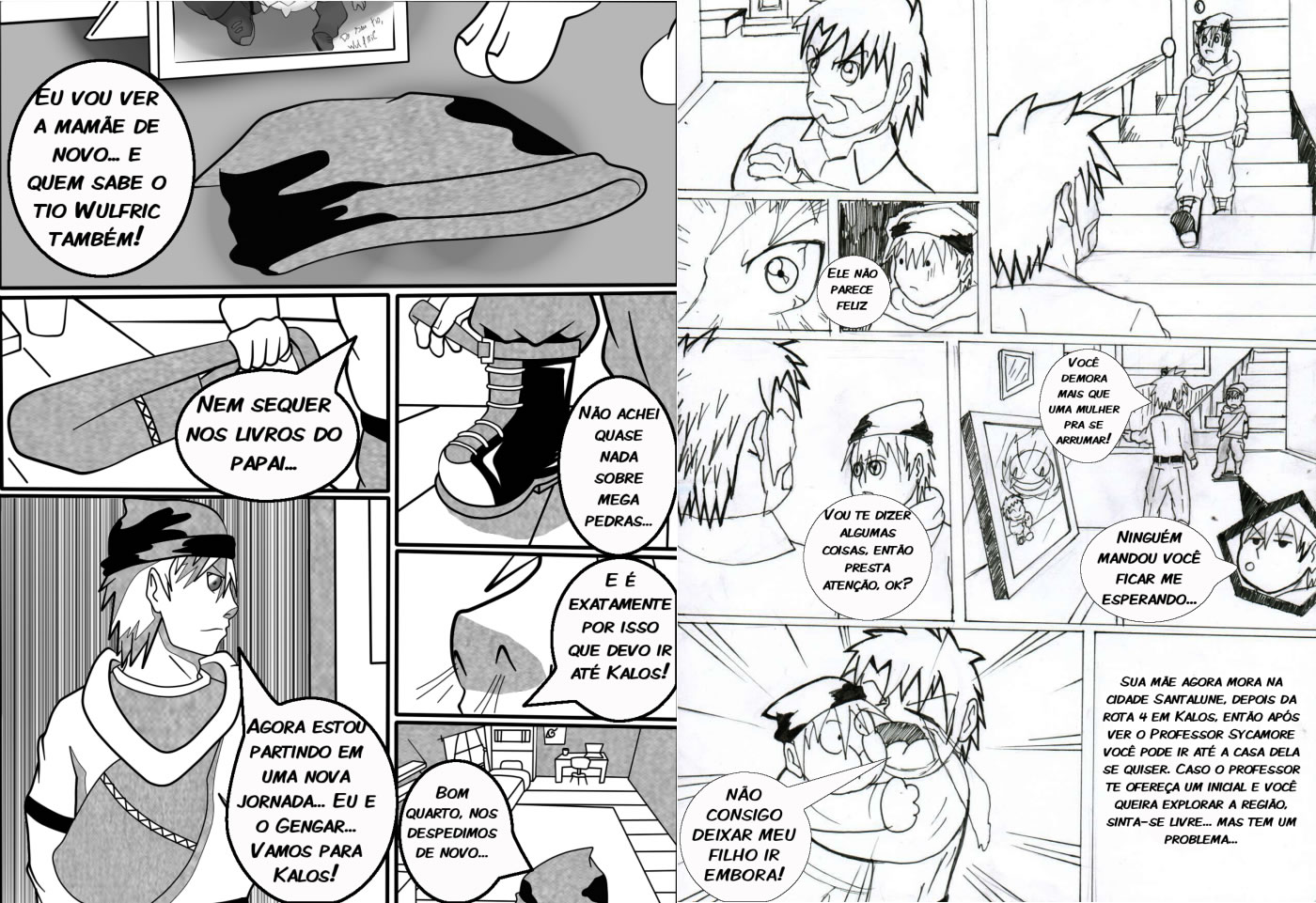 A ideia veio meio que do nada. Eu sempre admirei o mundo Pokémon, e sempre achei incrível o quão vasto ele era. Porém, sempre achei que o mangá e o anime não eram muito "fieis" aos jogos falando em termos de batalha, até que saiu o especial Pokémon: The Origin, que pra mim foi uma produção linda e que conseguiu passar a fidelidade dos jogos. Então já comecei a ficar com vontade de criar algo. Outra coisa é que desde que comecei a jogar Pokémon, eu sempre me desenhava com minha equipe Pokémon no Hall da Fama, e um dia resolvi postar um desses desenhos na internet, até que um internauta disse "pô cara, achei bem legal o desenho, você podia fazer um mangá narrando as tuas aventuras dos jogos". Esse foi o empurrão que eu precisava, então eu pensei: "poxa, por que não?" E assim comecei a pensar em um roteiro, e depois de alguns meses, surgiu o primeiro capítulo.Qual o processo e tempo de produção de um único capítulo?Isso varia muito, então vou usar como base o segundo capítulo. Eu começo pensando no roteiro e imaginando as cenas, depois vou escrevendo falas e observações num papel à parte. Normalmente levo 1 semana para pensar no roteiro, isso com a ajuda de minha irmã. Depois de concluir o roteiro, começo a fazer os rascunhos das cenas que imaginei antes, e esse com certeza é o processo mais demorado, sendo que para o capítulo 2 levei 1 mês. Após rascunhar todas as páginas, começo a finalizar utilizando caneta e tinta, e isso leva mais ou menos umas 2 semanas. Depois de finalizar tudo, escaneio as páginas e faço os últimos detalhes no editor de imagens, e adiciono os textos, sendo que esses dois processos levam umas 3 ou 4 horas. Depois reviso tudo para verificar se não há erros ou contradições no roteiro. Se tudo estiver certo, eu apenas posto na página. A, claro, também tem a capa, que por ser colorida levo umas 5 horas para rascunhar, finalizar e colorir. Parece muito tempo, mas tenho que lembrar que não me dedico apenas ao mangá, pois também tenho outras obrigações. Caso eu me dedicasse inteiramente ao mangá, o tempo de tudo seria beeeem mais curto.Você já tem toda a história planejada ou está pensando enquanto lança cada capítulo?Já tenho toda a história na cabeça. Dessa forma, posso deixar "easter eggs" de acontecimentos futuros em cada capítulo, além de que se eu fosse mudar o roteiro em cada capítulo, ia virar uma bagunça, então eu pensei " vou me planejar pelo menos nos acontecimentos mais importantes, depois começo a desenhar"Por que a publicação digital ao invés da produção impressa de um fanzine?É uma questão tanto de custo como de comodidade. Na internet, consigo atingir um público grande e todos podem acompanhar gratuitamente. Se eu fosse fazer uma fanzine impressa, teria que me preocupar com custos de produção e vendas, além de que meu público seria bem mais limitado.Como você aprendeu a desenhar?Desde bem pequeno sempre gostei de desenhar, embora eu deva admitir que comecei tirando cópia de outros desenhos, mas nessa época nem me preocupava em rascunhos ou arte final. Depois que fiquei mais velho comecei a gostar muito de animes e mangás e do estilo de desenho, então comecei a criar meus próprios personagens, estudar anatomia, comecei a usar diferentes tipos de lápis para cada situação, desenhar cenários (embora eu nunca tenha sido bom nisso) e depois de muito muito muito tempo fazendo desenhos só a lápis, aprendia o que era arte final e que ficava bem melhor finalizar com tinta do que com o lápis. E agora estou aqui, fazendo um fan mangá de Pokémon. Mas não posso dizer que acabou, ainda tenho muito o que aprender, porque desenhar é um processo no qual você está sempre aprendendo coisas novas.Tem alguma dica para as pessoas que também sonham em publicar seu mangá ou fanzine?Minha dica é não desanimar, porque, vai por mim, quando você começa a rascunhar uma página, tem grandes chances de você simplesmente pensar "por que eu tô fazendo isso?", ainda mais se não houver nenhum retorno financeiro. Mas não há sensação melhor do que ver mais um capítulo completo. Haverão pessoas que vão gostar, e também haverão pessoas que não vão, mas o importante é erguer a cabeça e seguir em frente, e claro, ser mente aberta para críticas construtivas dos leitores, afinal, é para eles que você está fazendo sua história.