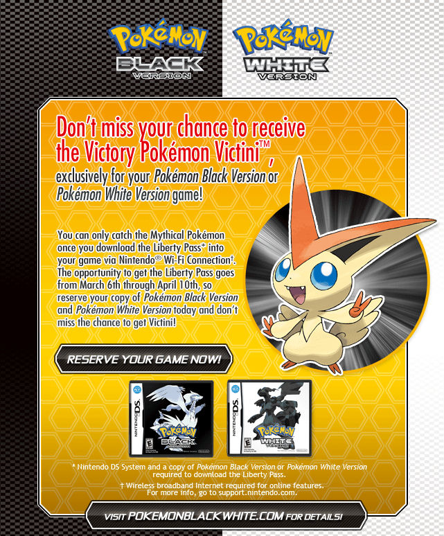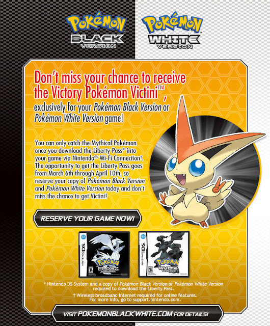 Essa foi também a primeira vez que vi Pokémon Back & White sendo vendidos nas livrarias Saraiva. Juntamente com o lançamento de Pokémon Black & White, Victini foi distribuído para todos os cantos do mundo! Era só ter o jogo, conexão on-line, e abrir o seu Mystery gift. A distribuição começou e terminou no Japão, de acordo com a data de lançamento por lá. E o mesmo se deu por aqui. A parte mais legal e que talvez esteja em falta hoje em dia, é que nesse evento em especial, não era o Pokémon que era baixado, mas sim uma passagem de barco que levava até uma ilha secreta dentro do jogo que escondia o monstrinho!
