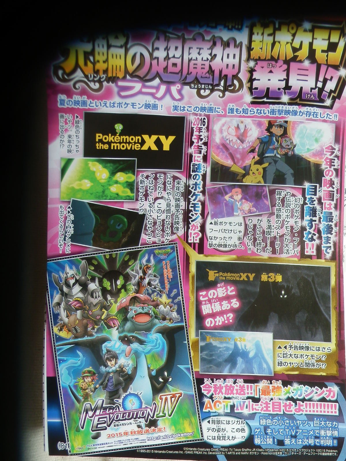 A nova edição da CoroCoro trouxe uma página inteira de informações a respeito das animações de Pokémon, no Japão. Além de mostrar um pouco de Zygarde em "Mega Evolution Act. 4", o artigo ainda traz algumas imagens do novo "Pokémon Misterioso", que apareceu em desenhos no cinema japonês em "Pokémon the Movie: Hoopa and the Clash of Ages".