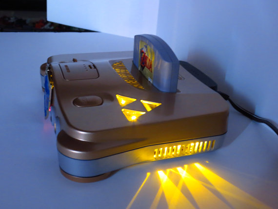 Este é o console que qualquer fã da franquia gostaria de ter. Com LEDS iluminando a Triforce e um Hylian Shild na frente, o console feito a mão custa R$ 800 no site Etsy.