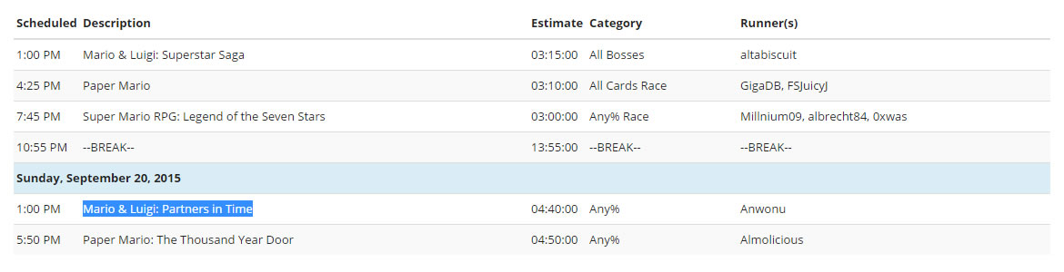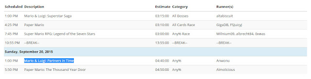 A maratona começará às 13h, conforme visto no cronograma abaixo. Nosso amigo Alex (vulgo Anwonu) participará no domingo com um speedrun de Mario & Luigi: Partners in Time.