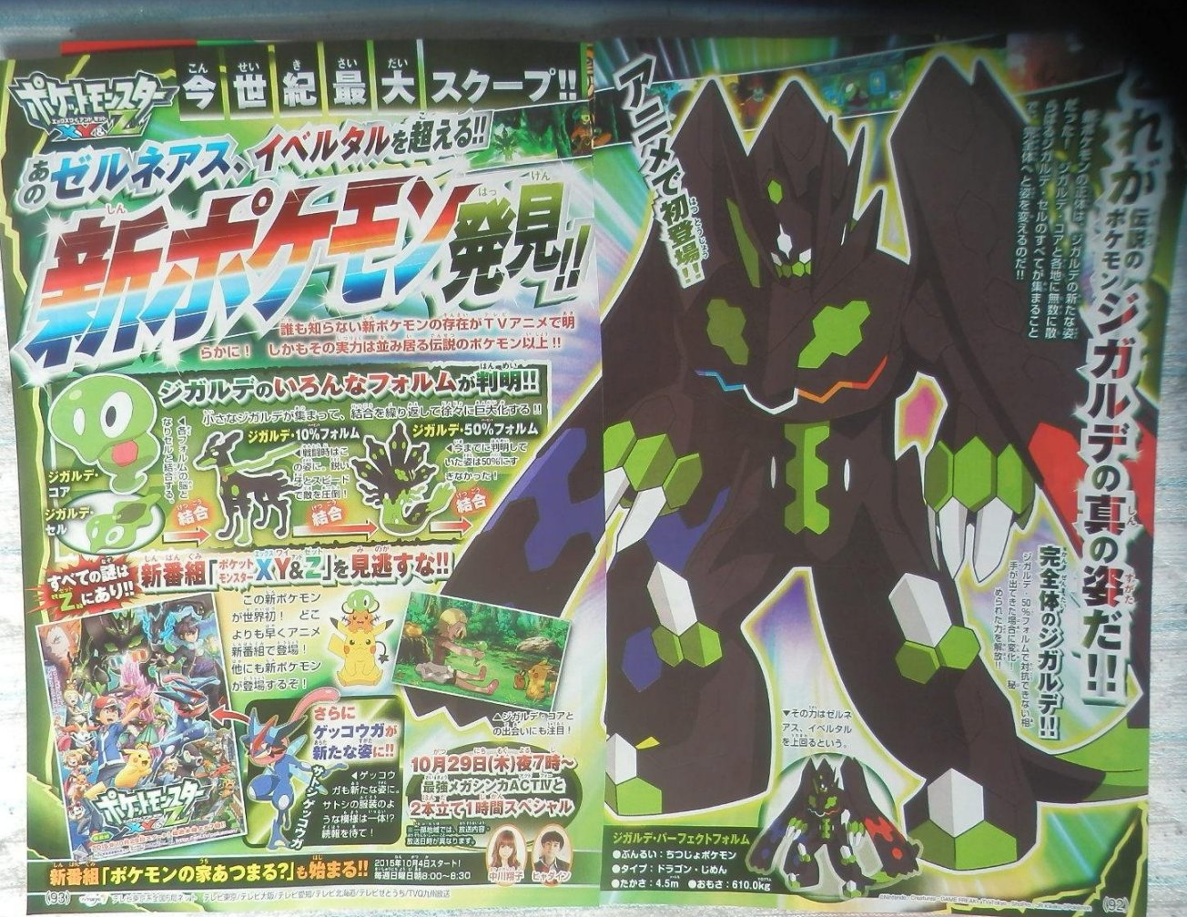 Fomos apresentados a 3 formas do monstro Zygarde: Zygarde 10% form, (forma canina) Zygarde 50% form (forma normal de serpente) e Zygarde Perfect form. (forma humanoide gigante). Também foi dito que aquele monstrinho verde é na verdade uma parte de Zygarde que funciona como um cérebro. Nesse caso, ele não é um Pokémon novo. Quando ele está em uma outra forma se chama Zygarde Cell. Em sua forma perfeita, o monstro terá 4 metros e meio e pesará mais de meia tonelada e é mencionado que ele passa Xerneas e Yveltal em poder. Além de tudo isso, teremos uma nova temporada no anime chamada XYZ, que contará com um novo episódio especial sobre a mega evolução. Por fim, o Greninja de Ash é mostrado de forma diferente no pôster. Nele, é mencionado que são roupas especiais. E se você analisar bem, o pôster veremos o relógio solar de Anistar City e possível entrada da equipe Flare no anime.