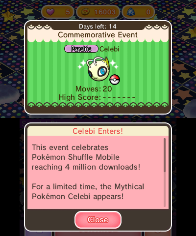 Como toda semana, novas fases foram adicionadas em Pokémon Shuffle, tanto na versão do 3DS quanto na versão para smartphones. Para celebrar os 4 milhões de downloads da versão mobile, uma nova fase permitirá enfrentar Celebi até o dia 9 de novembro.