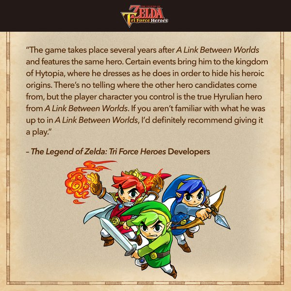 A cronologia de The Legend of Zelda não é a mais simples do mundo, se dividindo em 3 linhas do tempo diferentes. Com a chegada de Tri Force Heroes, o novo jogo da franquia, os fãs se perguntaram onde o game se encaixaria na cronologia. Esta foi uma das perguntas mais votadas no Twitter da Nintendo, que ofereceu uma resposta oficial.
