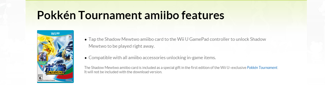 O site oficial da Nintendo parece ter deixado escapar uma novidade e tanto quanto a Pokkén Tournament. Na página de compatibilidade dos amiibos nos jogos Nintendo, a parte referente ao game de luta dos monstrinhos descreveu que todos os amiibos são compatíveis com Pokkén, desbloqueando itens dentro do jogo. Veja como é colocado no site: