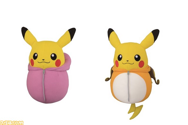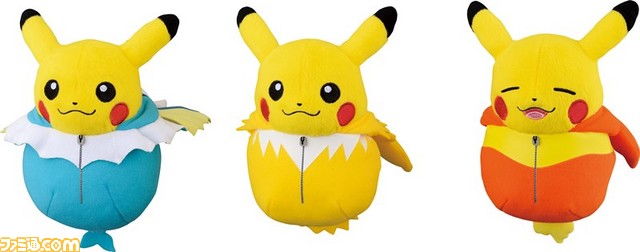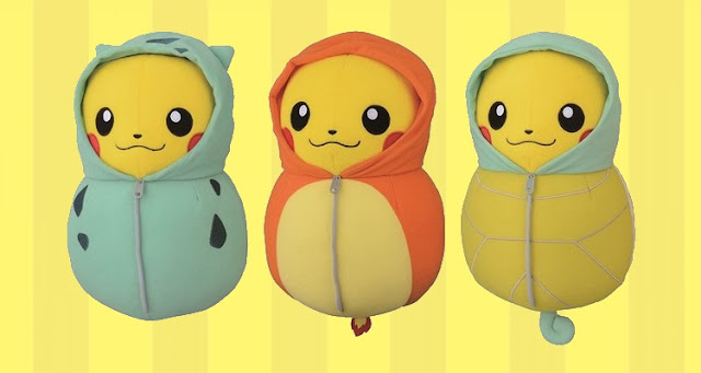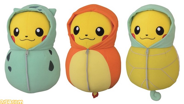As pelúcias contam com Pikachu entro de um pequeno saco com uma toca que pode ser colocada ou não em sua cabeça. São 2 modelos diferentes de 13cm ou 24cm, baseados em Pokémon como Squirtle, Bulbasaur, Charmander, Vaporeon, Flareon, Jolteon, Ditto e Raichu.