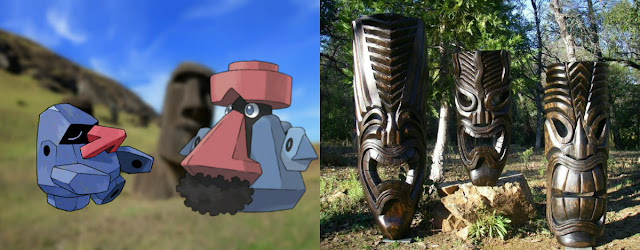 Seguindo na onda de aves e misticismo, chegamos em Natu e Xatu. Essas aves recebem inspiração da cultura nativa sul-americana, mas poderiam ter isso mudado para Alola. Então, que cultura pegar emprestada? A dos Tiki, responsáveis por tantos rituais e peças históricas do Havaí. Talvez, os Xatu tenham até influência nas erupções de vulcões do arquipélago, devido à sua influência nas crenças místicas do local.