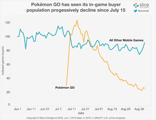 Depois de 2 meses desde seu lançamento oficial, é inevitável que Pokémon GO passe a mostrar sinais de perda da empolgação do público. Já vimos gráficos que mostravam a estabilização dos usuários ativos, mas aparentemente os usuários pagantes também tem caído de acordo com dados da Slice Intelligente.